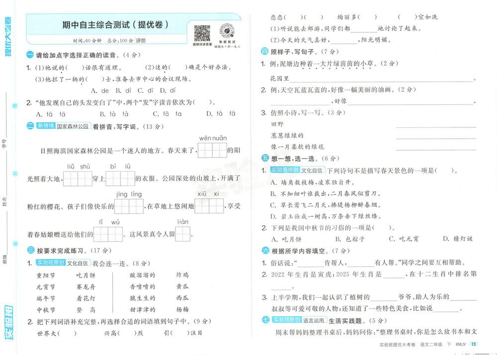 新教材人教版二年级语文下学期期中测试卷二十六