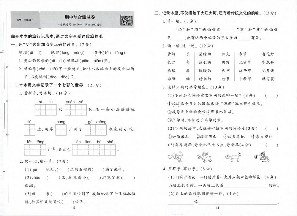 新教材人教版二年级语文下学期期中测试卷三十六