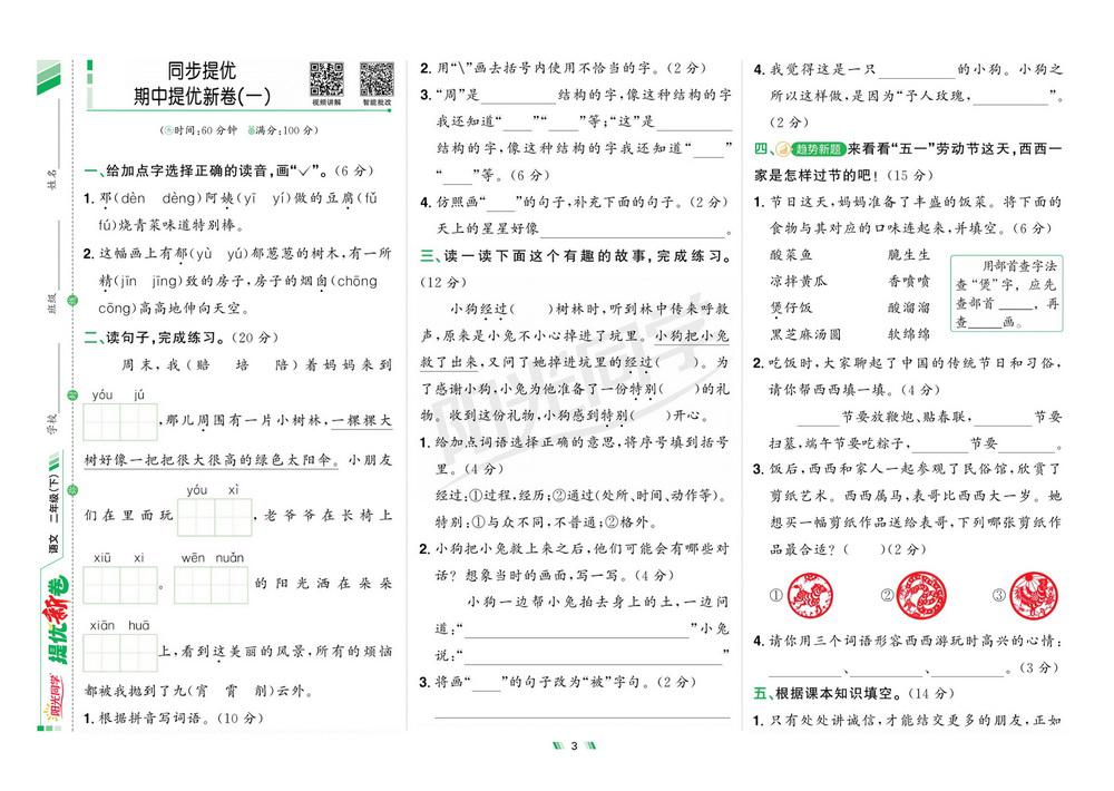 新教材人教版二年级语文下学期期中测试卷四十一