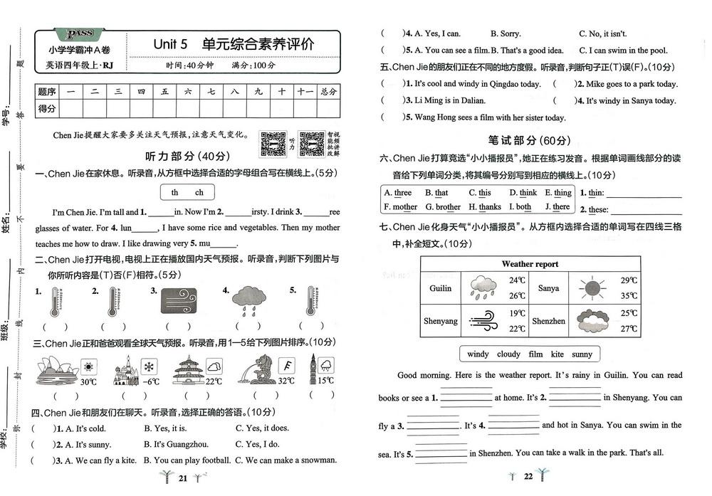新教材人教PEP版四年级上册英语unit5测试卷十四