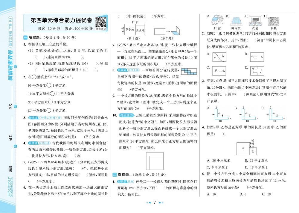 新教材人教版三年级下册数学第四单元测试卷四十