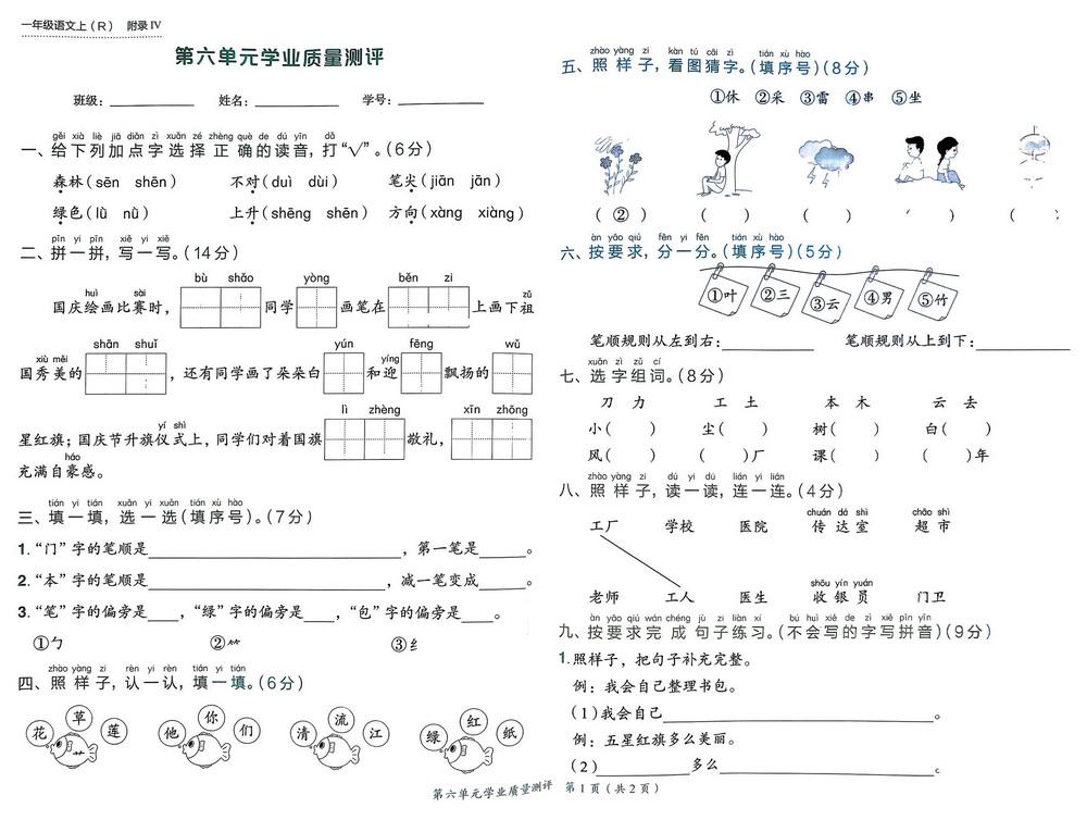 新教材人教版一年级上册语文第六单元测试卷二十三