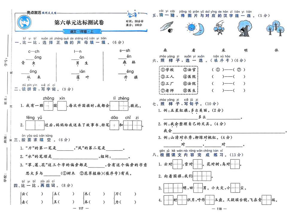 新教材人教版一年级上册语文第六单元测试卷二十六