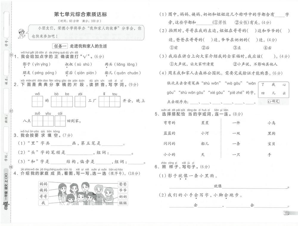 新教材人教版一年级上册语文第七单元测试卷一