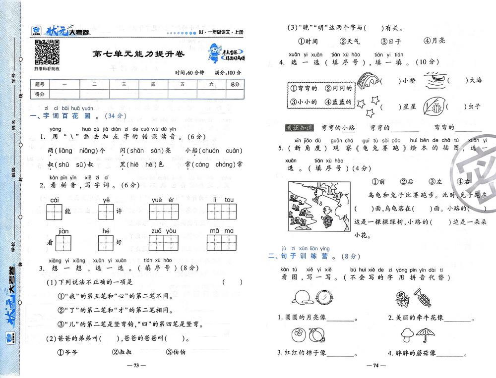 新教材人教版一年级上册语文第七单元测试卷二十二