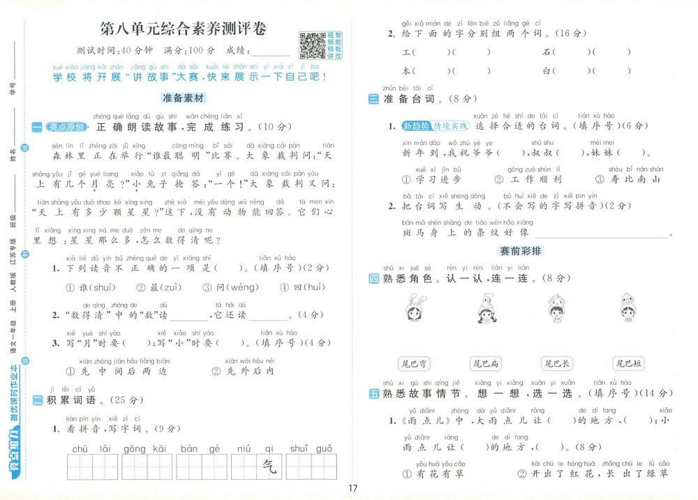 新教材人教版一年级上册语文第八单元测试卷二十