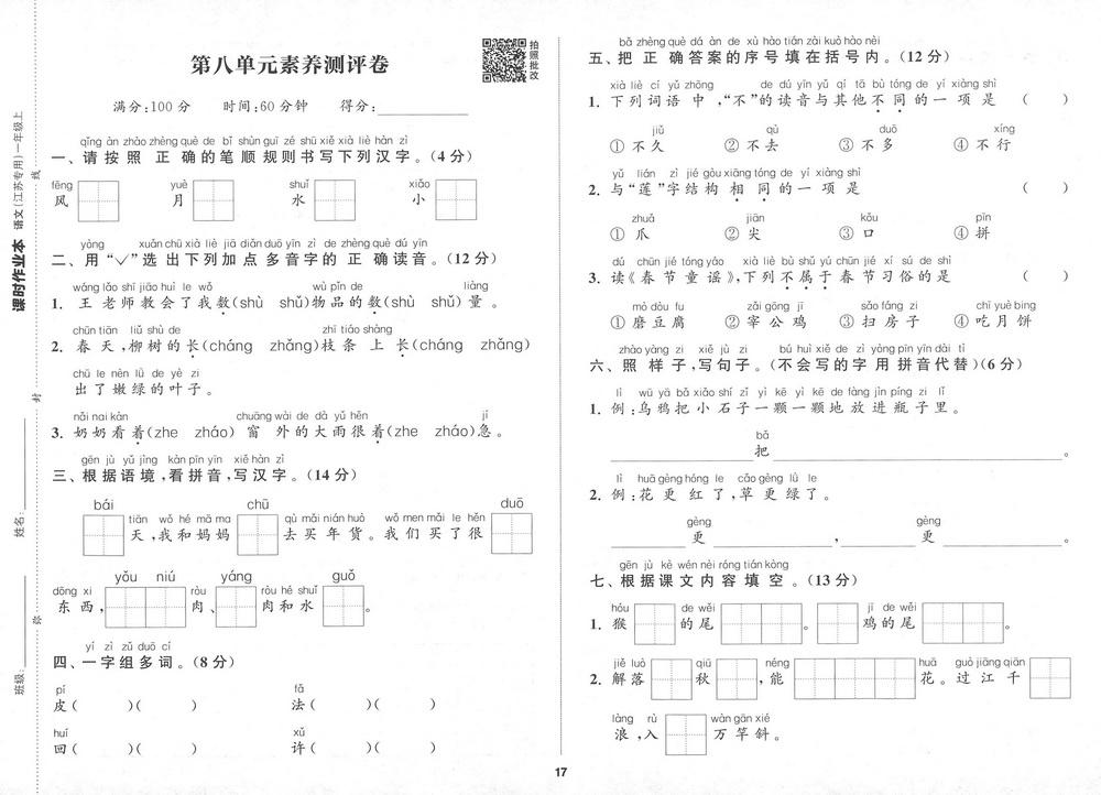 新教材人教版一年级上册语文第八单元测试卷二十一