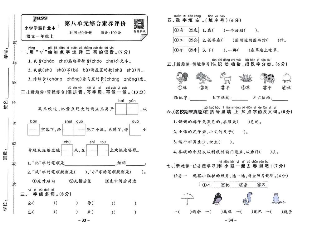 新教材人教版一年级上册语文第八单元测试卷二十七