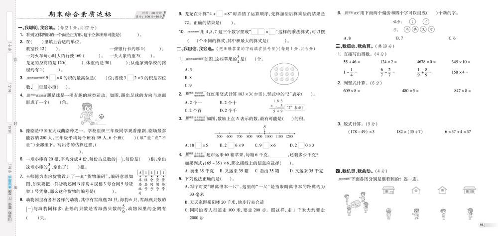 新教材人教版三年级数学上册期末测试卷一