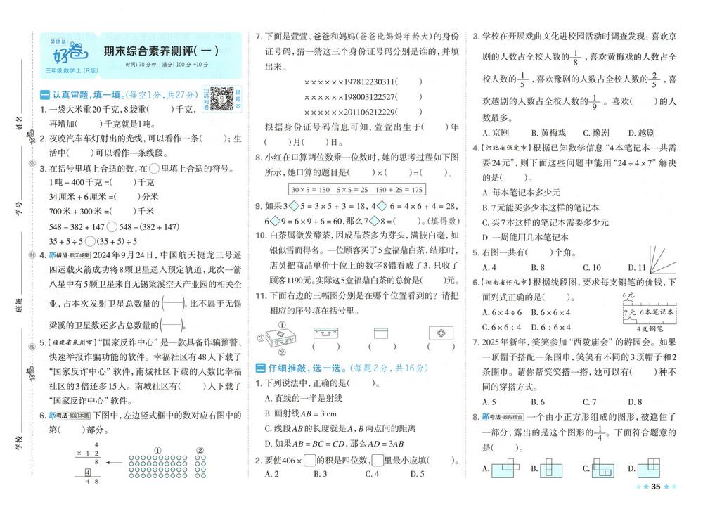 新教材人教版三年级数学上册期末测试卷三