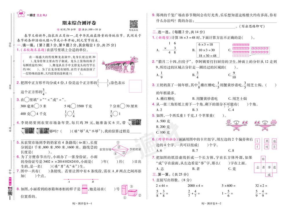 新教材人教版三年级数学上册期末测试卷五
