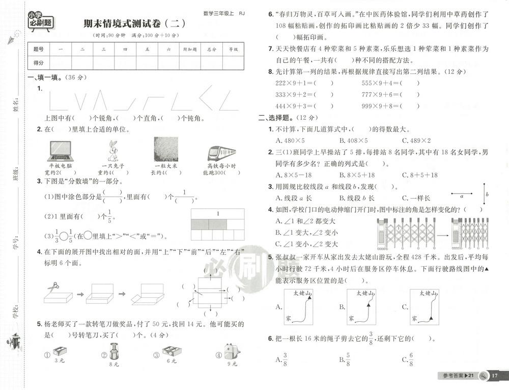 新教材人教版三年级数学上册期末测试卷二十一