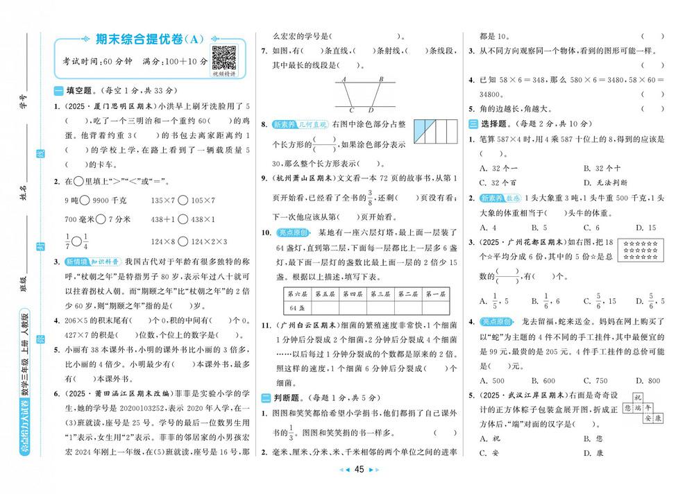 新教材人教版三年级数学上册期末测试卷二十二