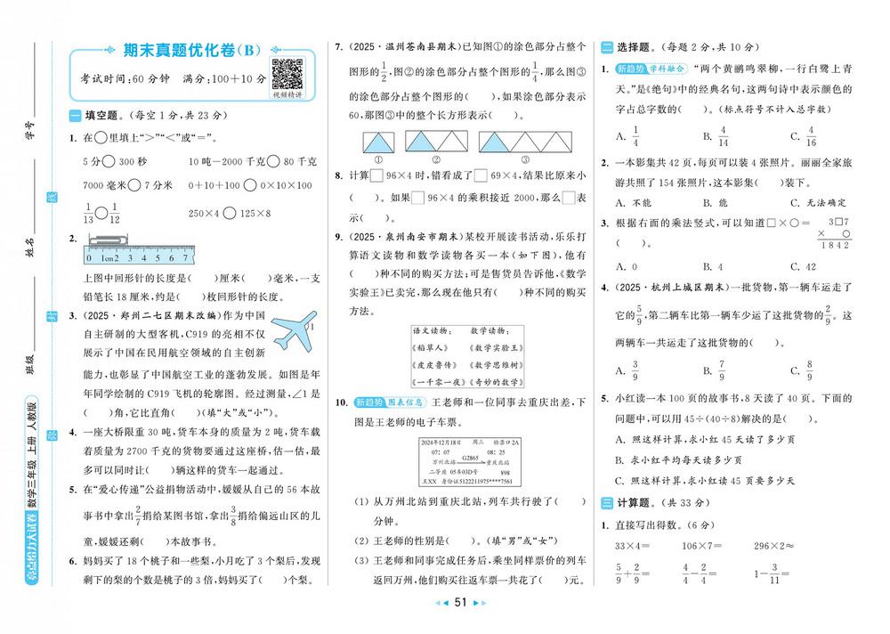 新教材人教版三年级数学上册期末测试卷二十五