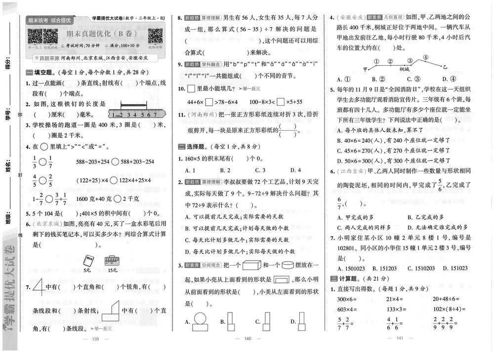 新教材人教版三年级数学上册期末测试卷三十六