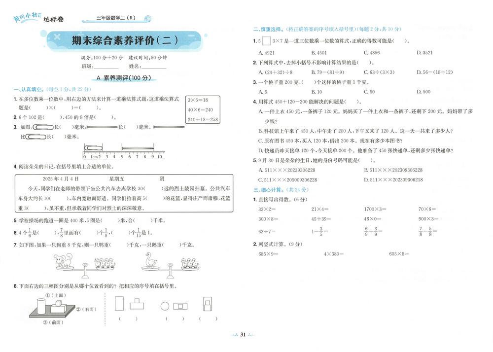 新教材人教版三年级数学上册期末测试卷四十三