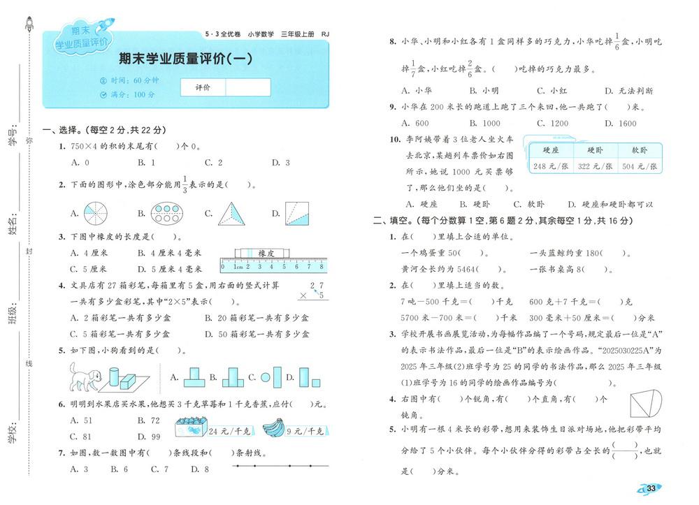 新教材人教版三年级数学上册期末测试卷五十