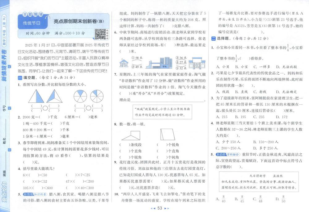 新教材人教版三年级数学上册期末测试卷五十八