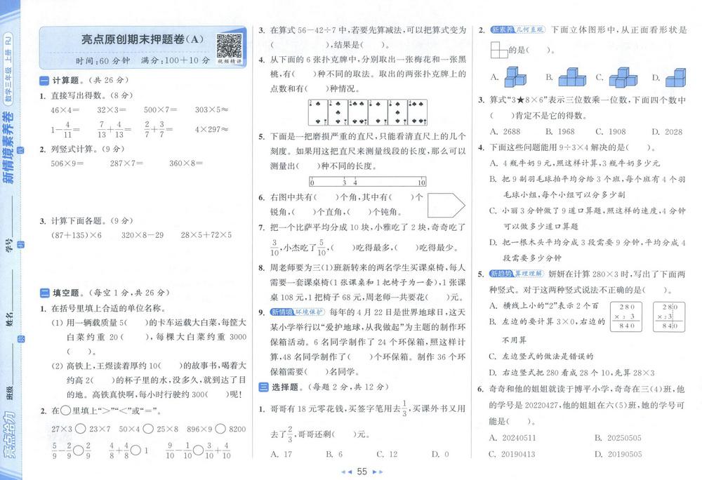 新教材人教版三年级数学上册期末测试卷五十九
