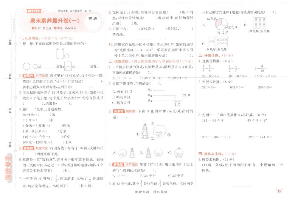 新教材人教版三年级数学上册期末测试卷六十七