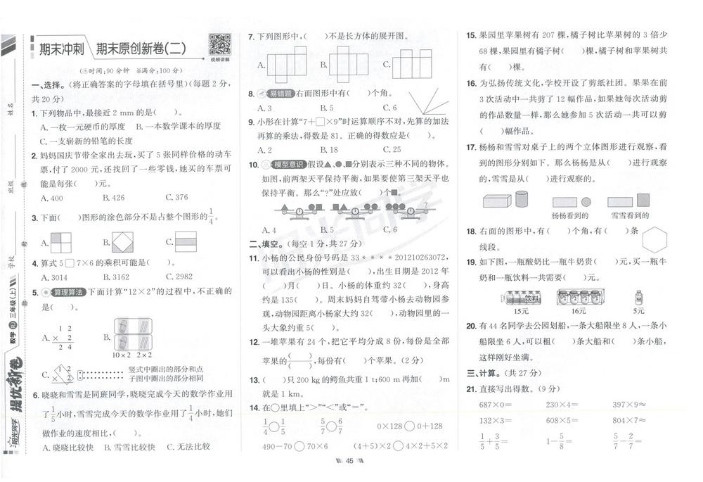 新教材人教版三年级数学上册期末测试卷七十四