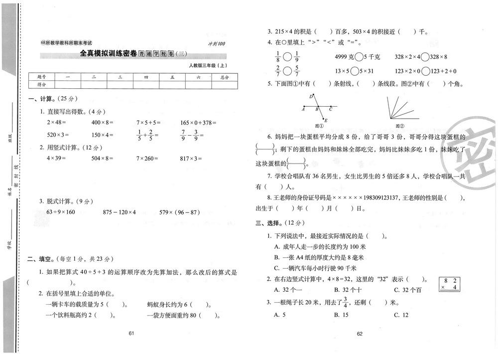新教材人教版三年级数学上册期末测试卷八十二