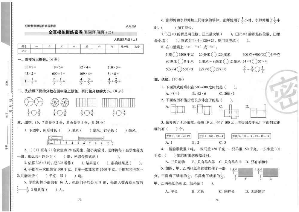 新教材人教版三年级数学上册期末测试卷八十五
