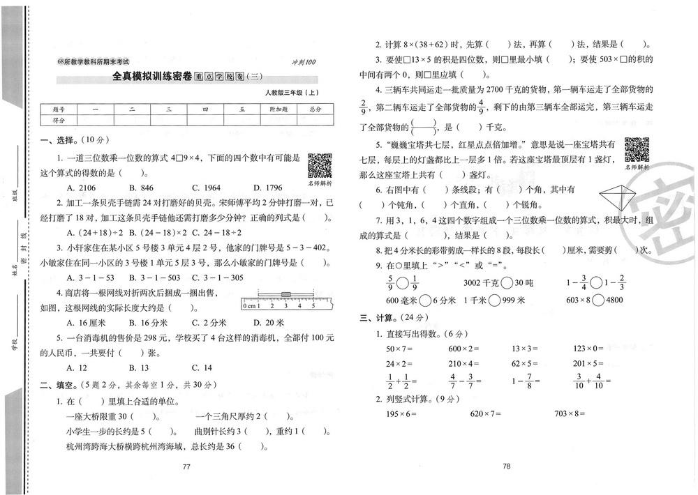 新教材人教版三年级数学上册期末测试卷八十六