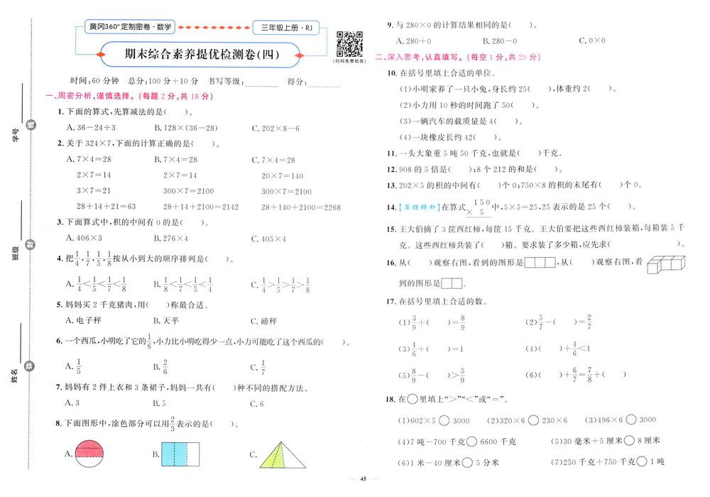 新教材人教版三年级数学上册期末测试卷九十二