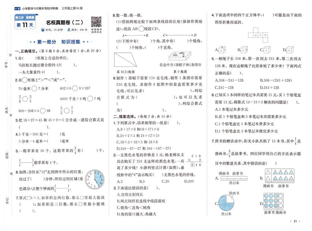 新教材人教版三年级数学上册期末测试卷九十八