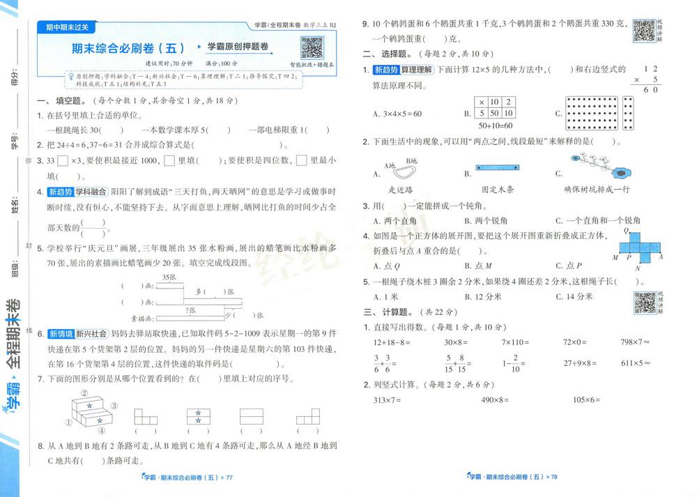 新教材人教版三年级数学上册期末测试卷一百零七