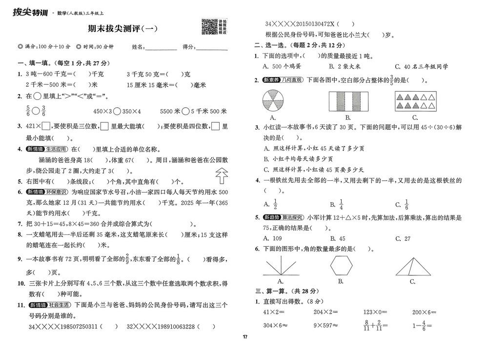 新教材人教版三年级数学上册期末测试卷一百一十五