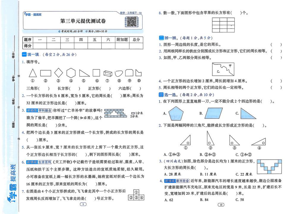 新教材人教版三年级下册数学第三单元测试卷十八