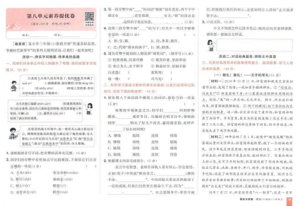 新教材人教版三年级上册语文第八单元测试卷十九video