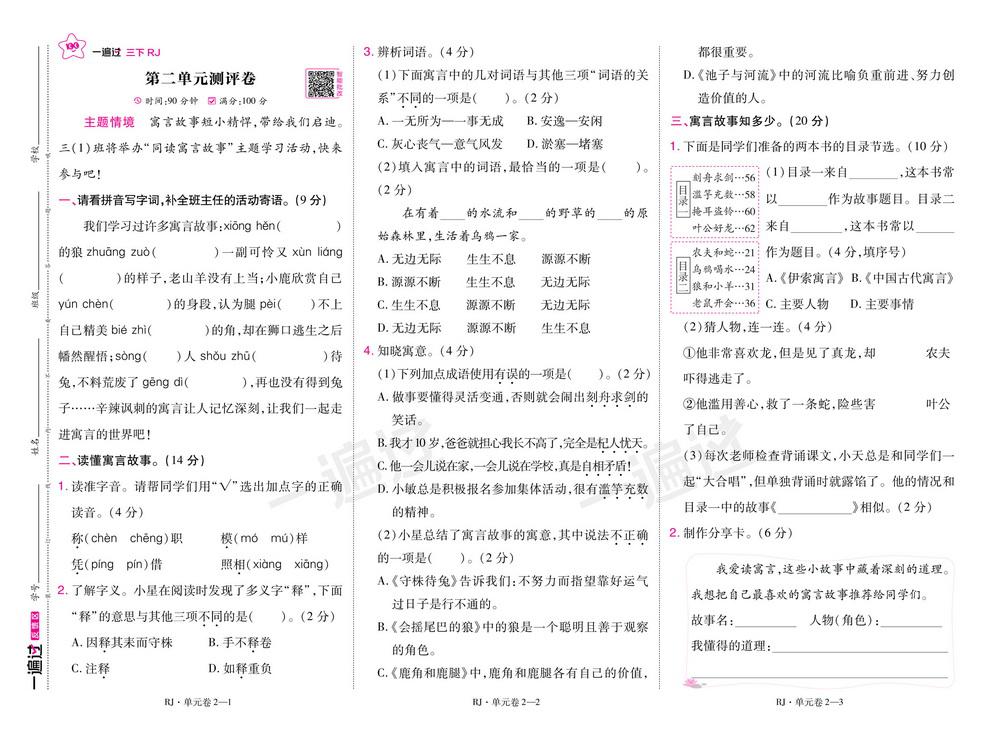 新教材人教版三年级下册语文第二单元测试卷四