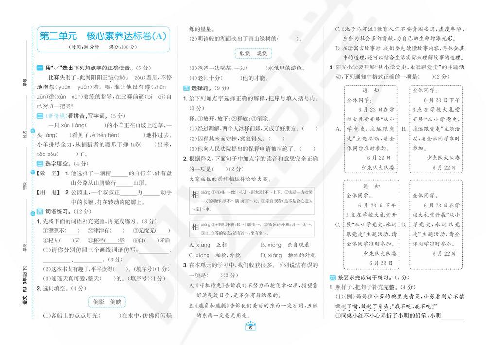 新教材人教版三年级下册语文第二单元测试卷五