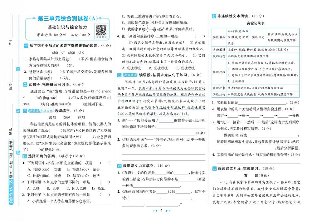 新教材人教版三年级下册语文第三单元测试卷十八