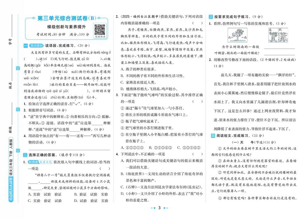新教材人教版三年级下册语文第三单元测试卷十九