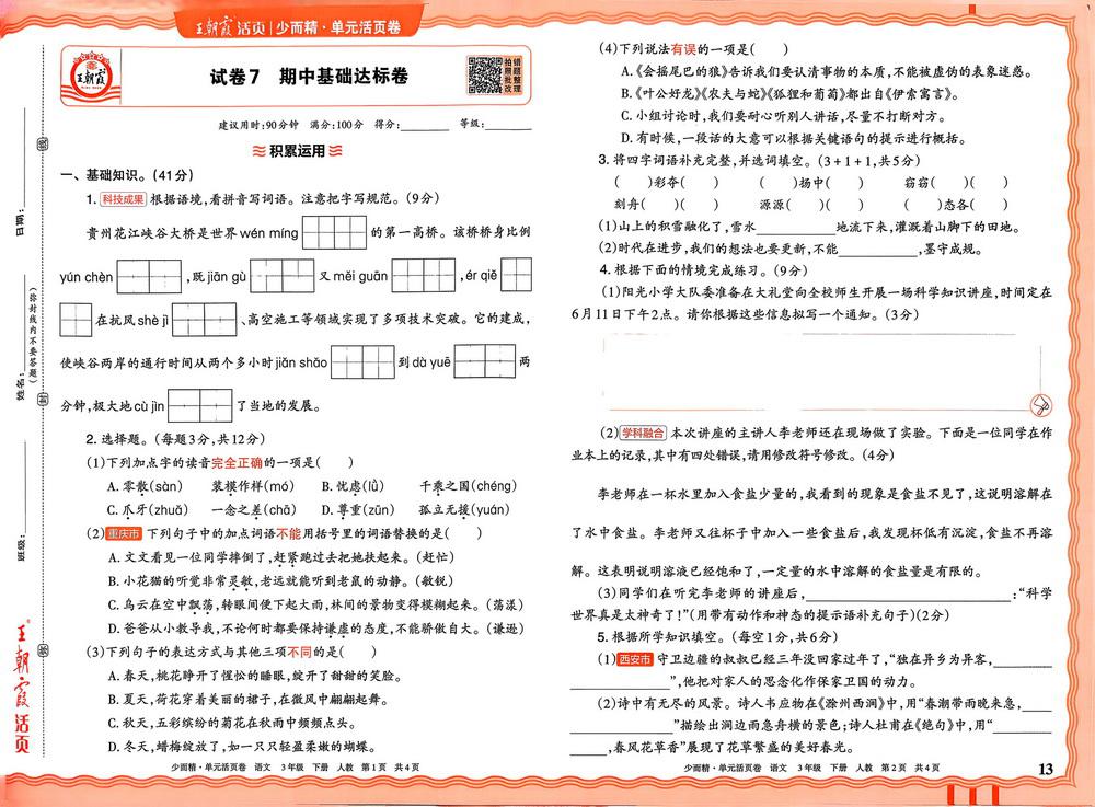 新教材人教版三年级下册语文期中测试卷十