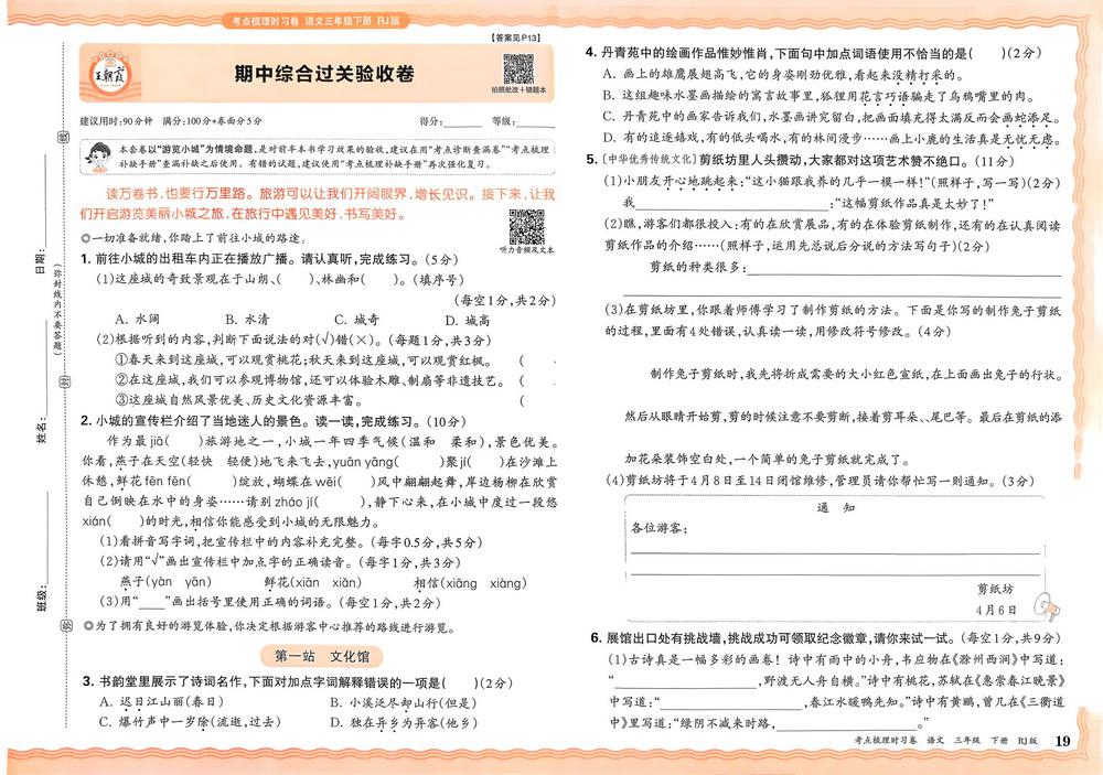 新教材人教版三年级下册语文期中测试卷十二