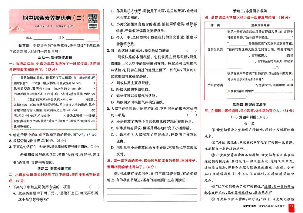 新教材人教版三年级下册语文期中测试卷十八