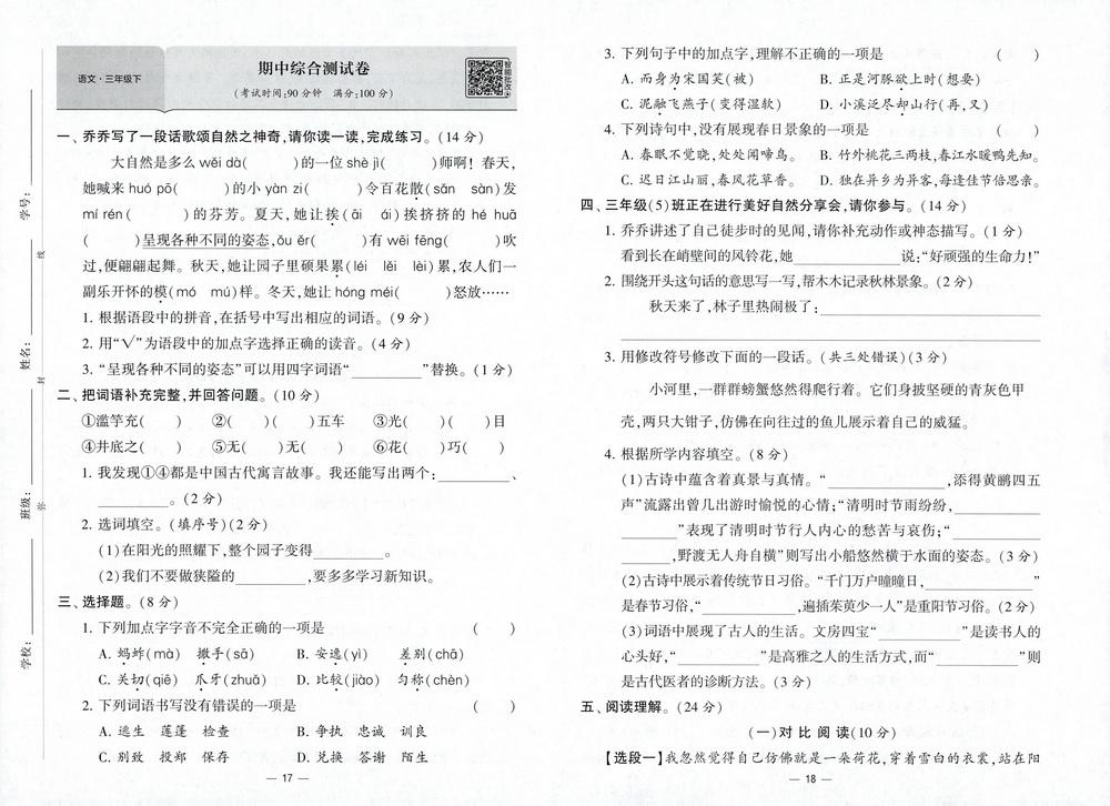 新教材人教版三年级下册语文期中测试卷二十