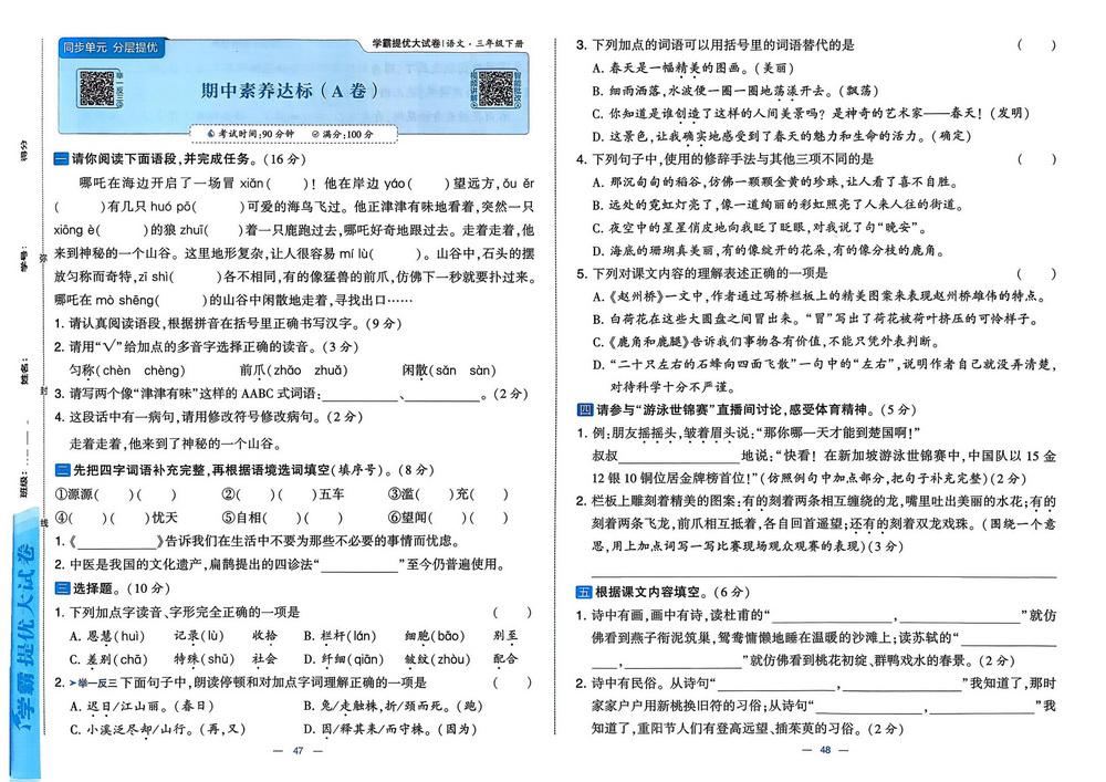新教材人教版三年级下册语文期中测试卷二十二
