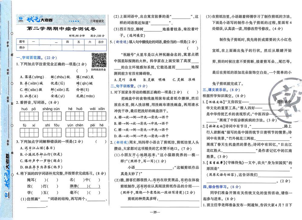 新教材人教版三年级下册语文期中测试卷三十六