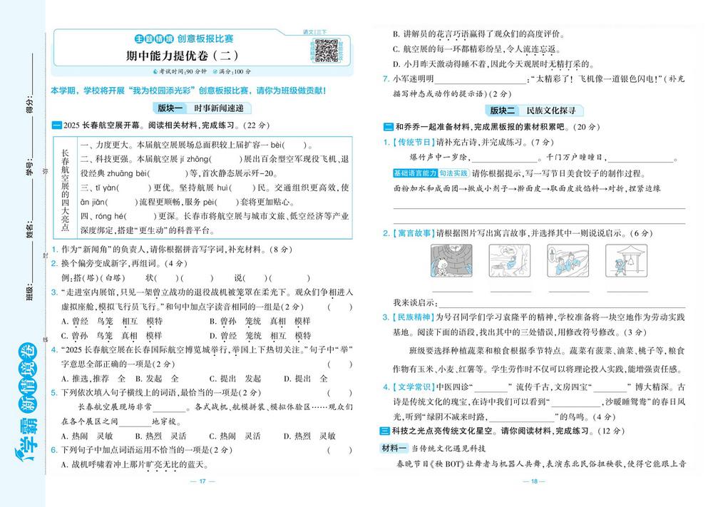 新教材人教版三年级下册语文期中测试卷四十