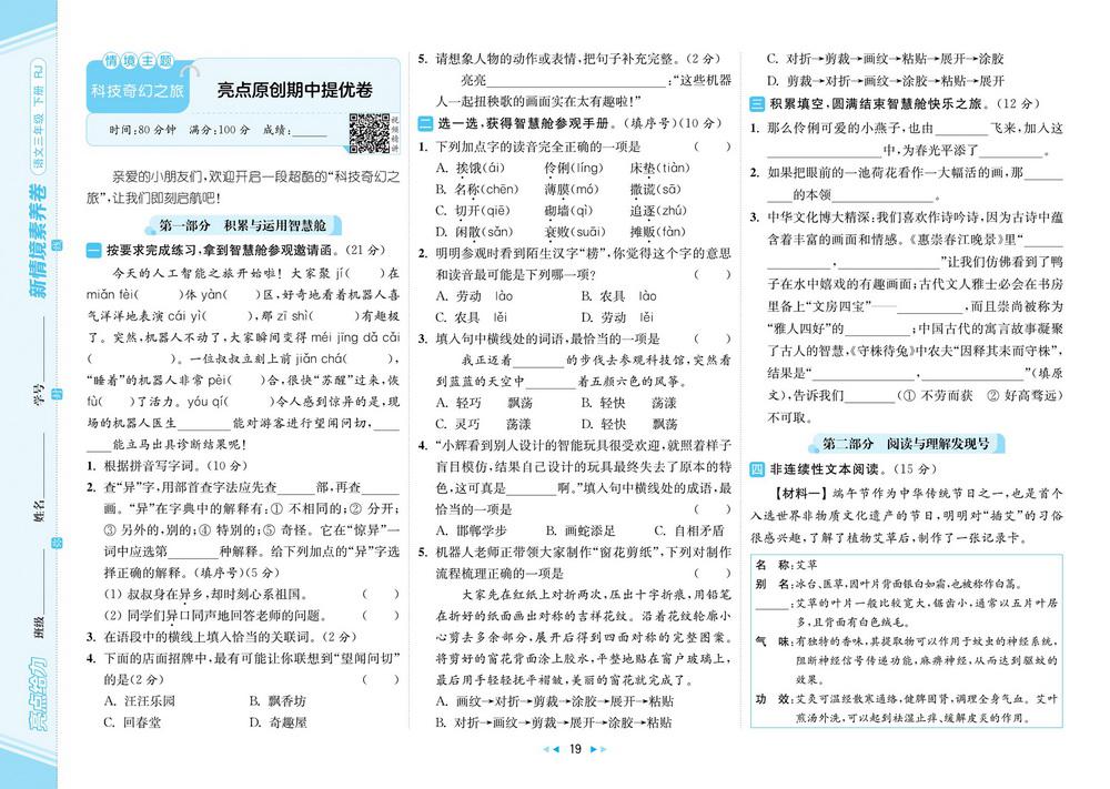 新教材人教版三年级下册语文期中测试卷四十六