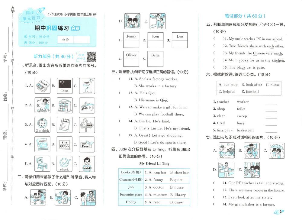 新教材人教PEP版四年级上册英语期中测试卷十二