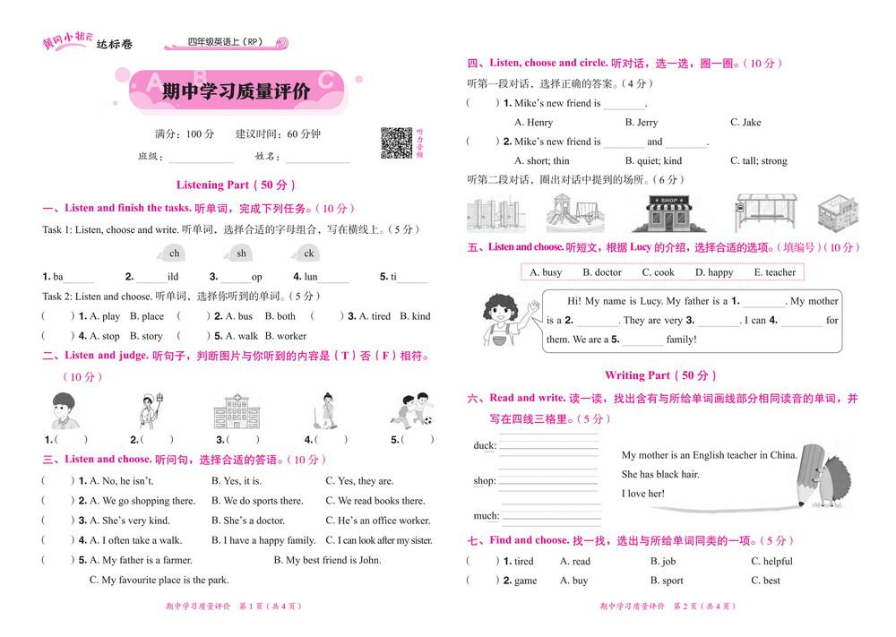 新教材人教PEP版四年级上册英语期中测试卷十九