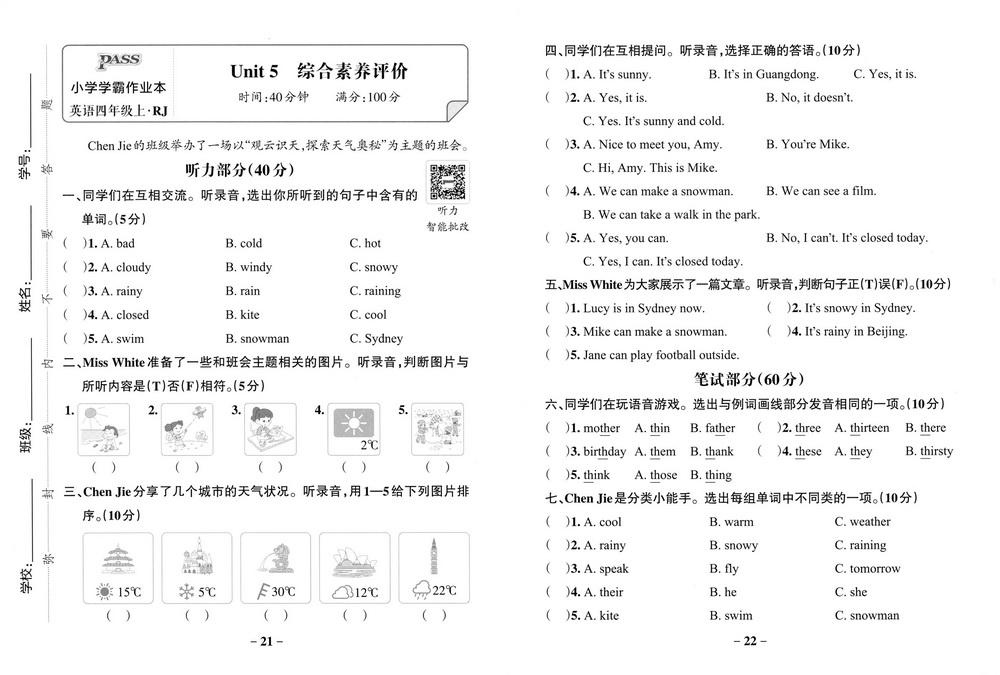 新教材人教PEP版四年级上册英语unit5测试卷十五