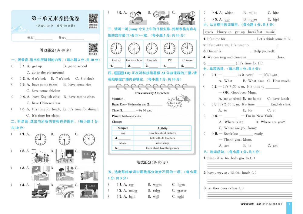 新教材人教PEP版四年级下册英语Unit3测试卷十二